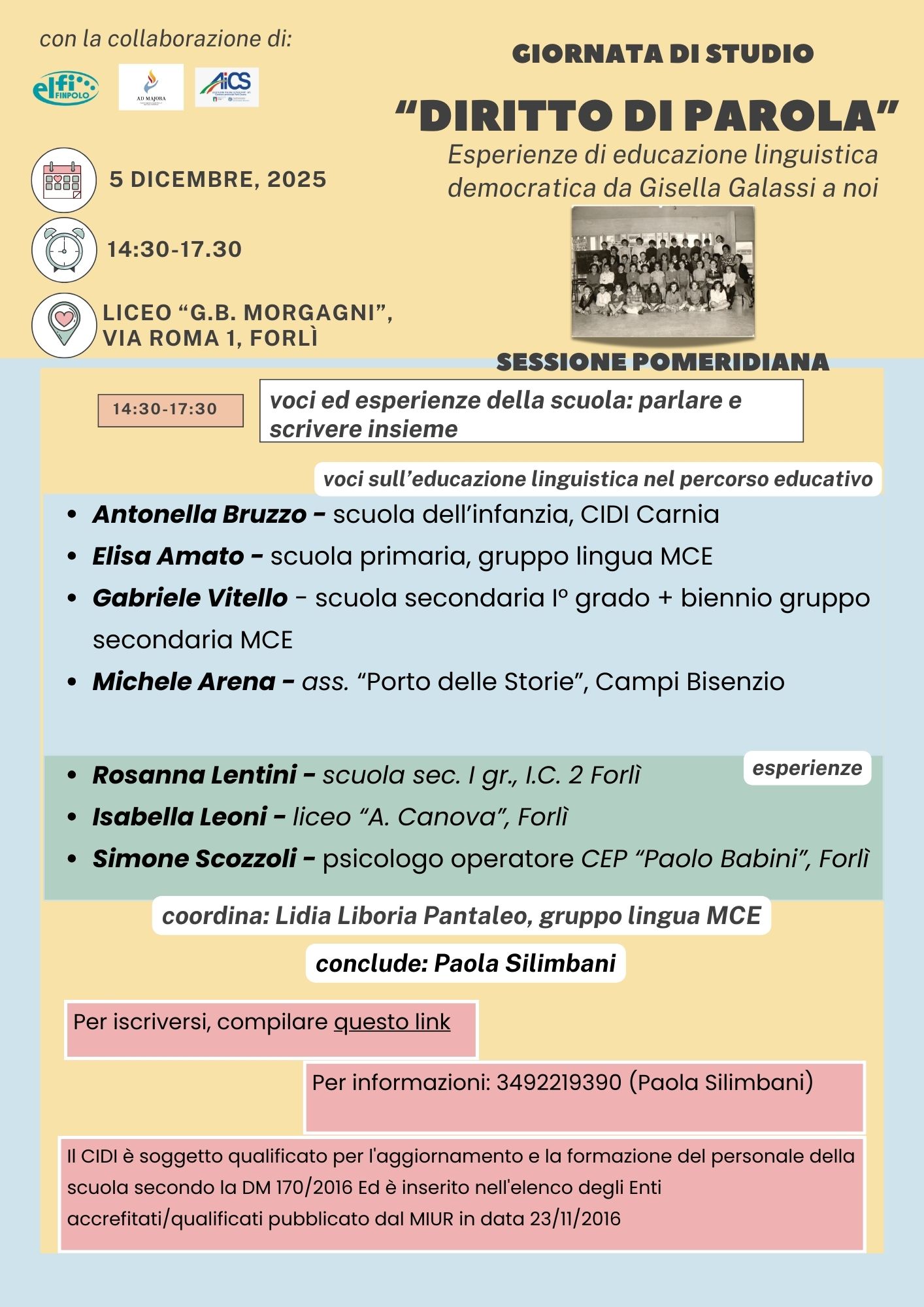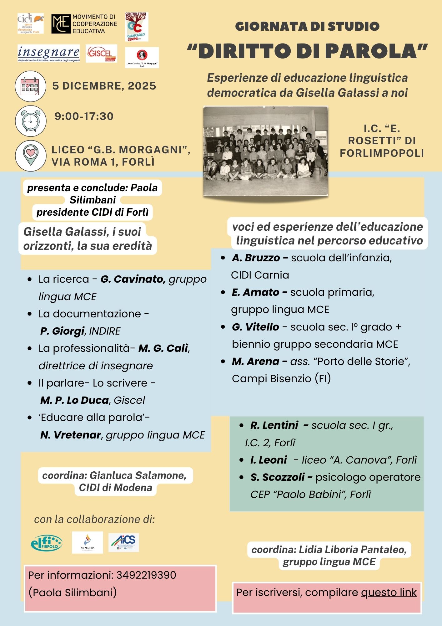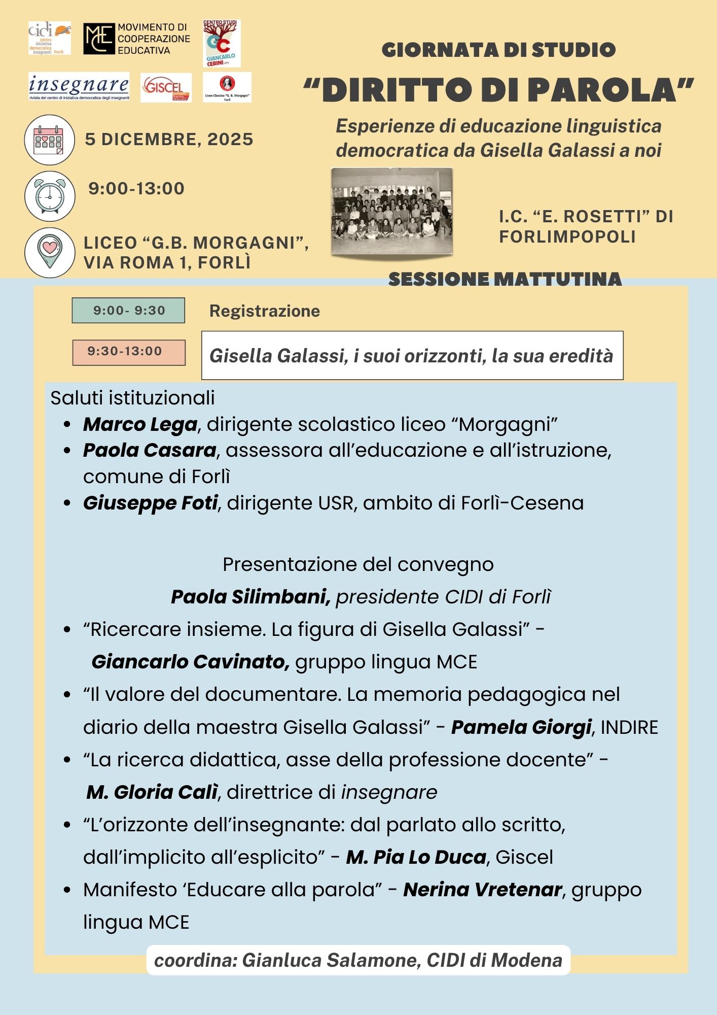 La giornata di studio parte comunque “a ritroso”. Il tempo infatti riannoda i fili del passato, della memoria di chi ci ha preceduto, dei “maestri” e delle “maestre”, di quelle figure che sono ancora testimonianza professionale assolutamente attuale ed innovativa . Per questo dedichiamo la prima parte della giornata al lavoro della maestra Gisella Galassi, forlivese di nascita e forlimpopolese di adozione, che molti hanno conosciuto e che abbiamo ricordato tre anni fa in un convegno nel centenario della sua nascita. In quella occasione i relatori esperti si resero conto del valore e dell’attualità del suo lavoro e della necessità di far conoscere il suo metodo, i suoi scritti, purtroppo irreperibili. Con un impegno notevole di Nerina Vretenar sono stati digitalizzati e fruibili oggi nell’open space di MCE e sul sito di INDIRE nello spazio dedicato alle maestre.
