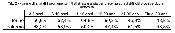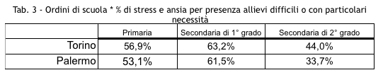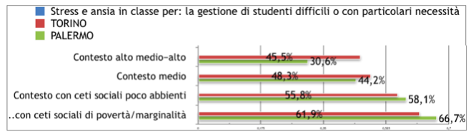Sono stati gli insegnanti stessi perciò a segnalare uniformemente che una delle cause principali dello stress e dell’ansia dei docenti- a Palermo la prima, a Torino la seconda, dopo la voce: “eccessivo carico di lavoro di tipo amministrativo/burocratico” - è risultata: “ la presenza di allievi difficili o con particolari necessità”.