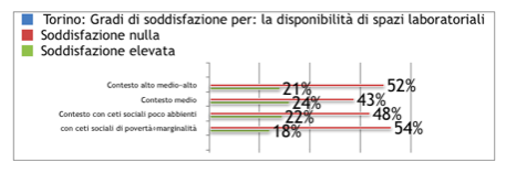 A Torino, mediamente e per qualunque contesto, la metà dei docenti è insoddisfatta degli spazi laboratoriali esistenti. Mentre, sempre mediamente, solo 1 di loro su 5 sostiene un alto grado di soddisfazione per lo stato attuale delle cose.
