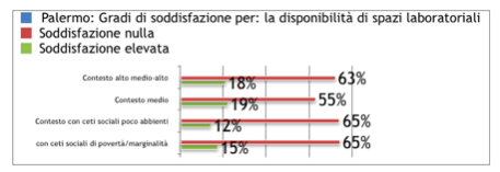 Ma è entrando più nel merito dell’organizzazione del modello didattico e delle sue inadeguatezze che si possono più facilmente proporre degli spunti di riflessione. Alla domanda, infatti, su come viene avvertita la disponibilità degli spazi laboratoriali emerge in modo abbastanza netto l’insoddisfazione dei docenti per la mancanza di tali spazi. E questo, per qualunque contesto socioculturale in cui è situata la scuola e sia a Torino, sia a Palermo, come si può facilmente osservare dai due grafici sotto riportati.