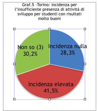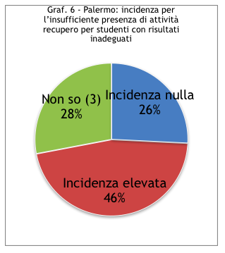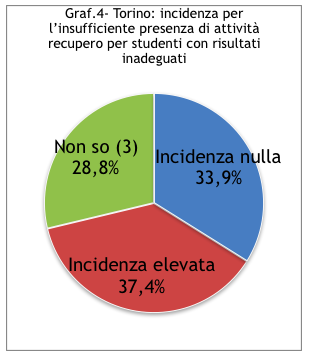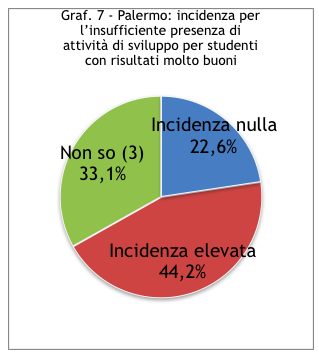 Il secondo dato che colpisce è il fatto che questa tripartizione tenda a ritenere - a Torino con qualche punto percentuale in più - tendenzialmente più grave l’assenza di attività da proporre a studenti con buoni risultati. Cioè per quelli più disponibili e più autonomi. Anche se il senso comune porterebbe a dire che questi ultimi sono quelli per i quali proporre attività in semi autonomia dovrebbe essere più semplice. A Palermo l’incidenza è seria in entrambi i casi. Non solo, tende a prevalere seppure di poco il problema del recupero. Ciò non toglie le perplessità rispetto ad una percentuale così alta per le carenti attività di potenziamento.
