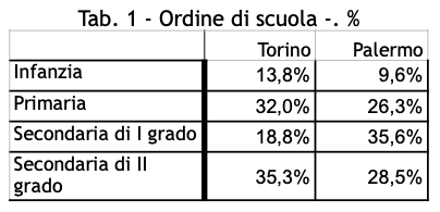 I dati delle due colonne non sono perfettamente allineati. In modo particolare spicca la differenza percentuale tra i docenti della secondaria di I grado delle due città campione. C’è perciò da segnalare che i dati di Torino sono più in linea con l’universo di riferimento del Ministero per quel territorio.