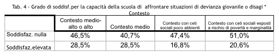 Alla domanda: “qual è il grado di soddisfazione per la capacità della scuola di affrontare situazioni di devianza giovanile o disagio”, le risposte dell’intero campione (media di quelle di Torino e Palermo) sono riportate nella Tabella N° 4.
