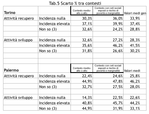 La tabella sotto riportata ( Tab 5) ne approfondisce l’analisi (grafici 4-7) mettendo a confronto tutte le voci dei contesti in esame, sia per l’insufficiente presenza di attività recupero che di potenziamento e per i campioni delle due città: